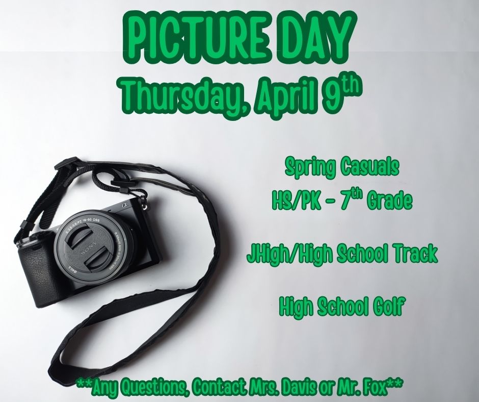 Spring casuals will be taken on Thursday, April 9th for Pre-K through 7th gradeSpring sports including HS, JH track and HS golf will also be taken on the 9thFor any questions please contact:Mrs. Da...
