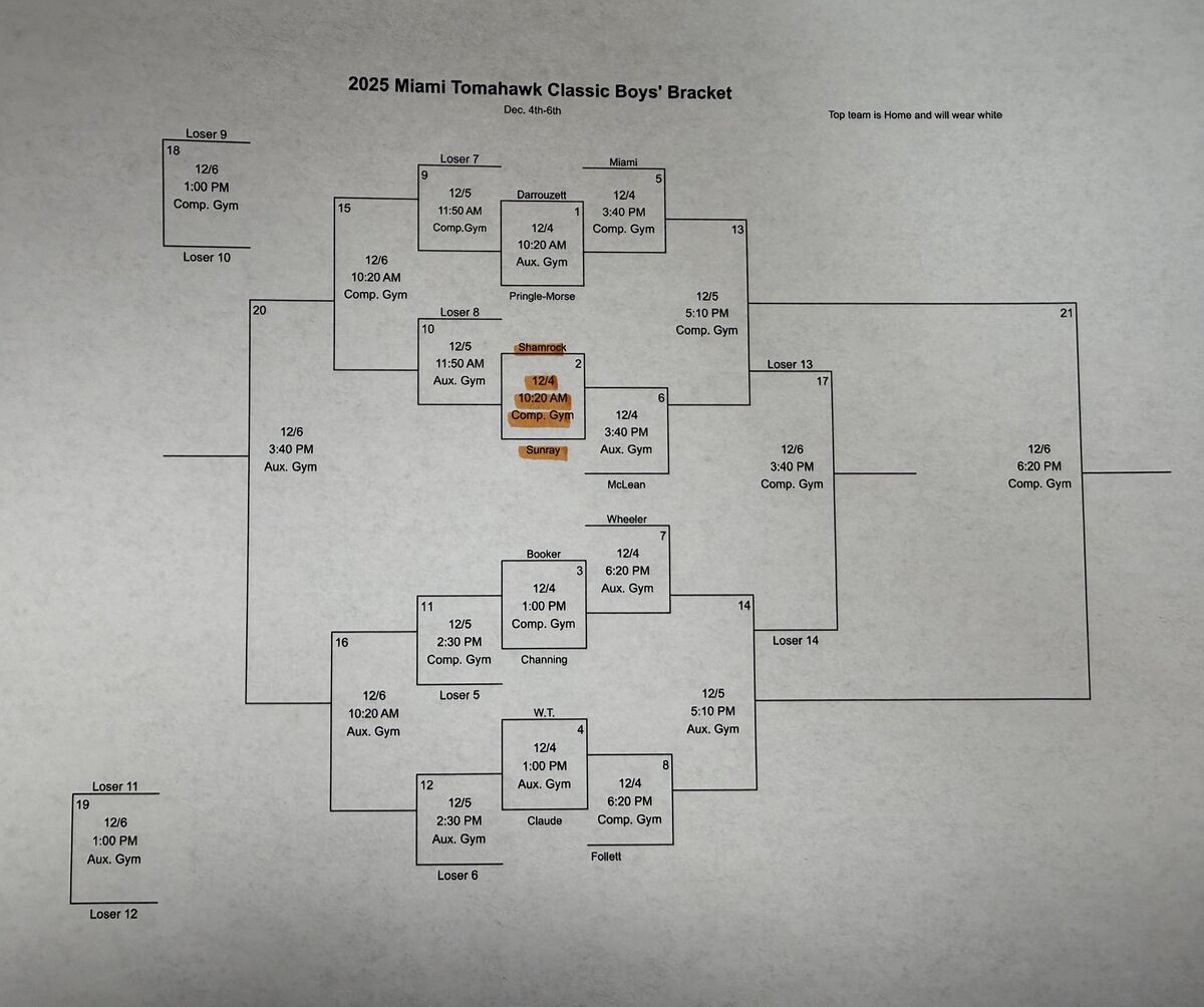 Due to West Texas High still playing football, the Shamrock JV Boys will be taking their spot in the Miami Tomahawk Tournament. Their first game will be Thursday at 1:00 PM, in the slot where WT is listed on the boys’ bracket.